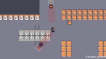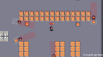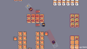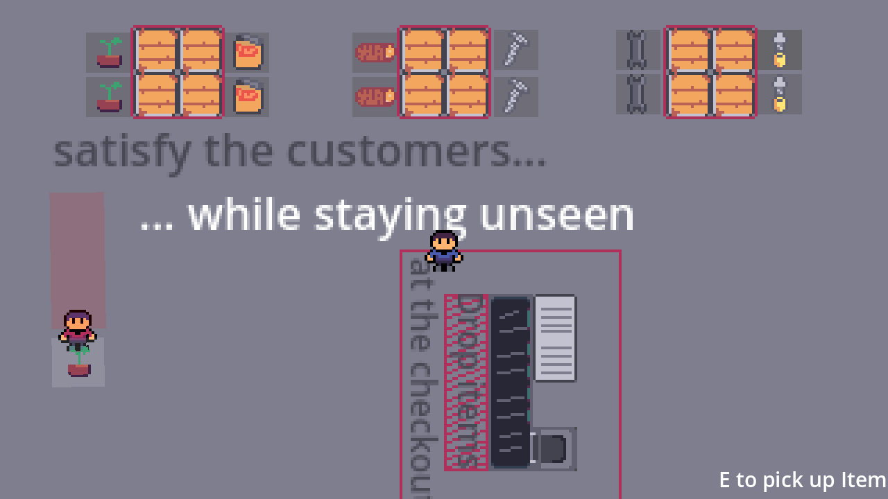 Satisfy the needs of the customers (Icon displayed below the customers) while staying unseen. (Don't run into the red field of view areas)